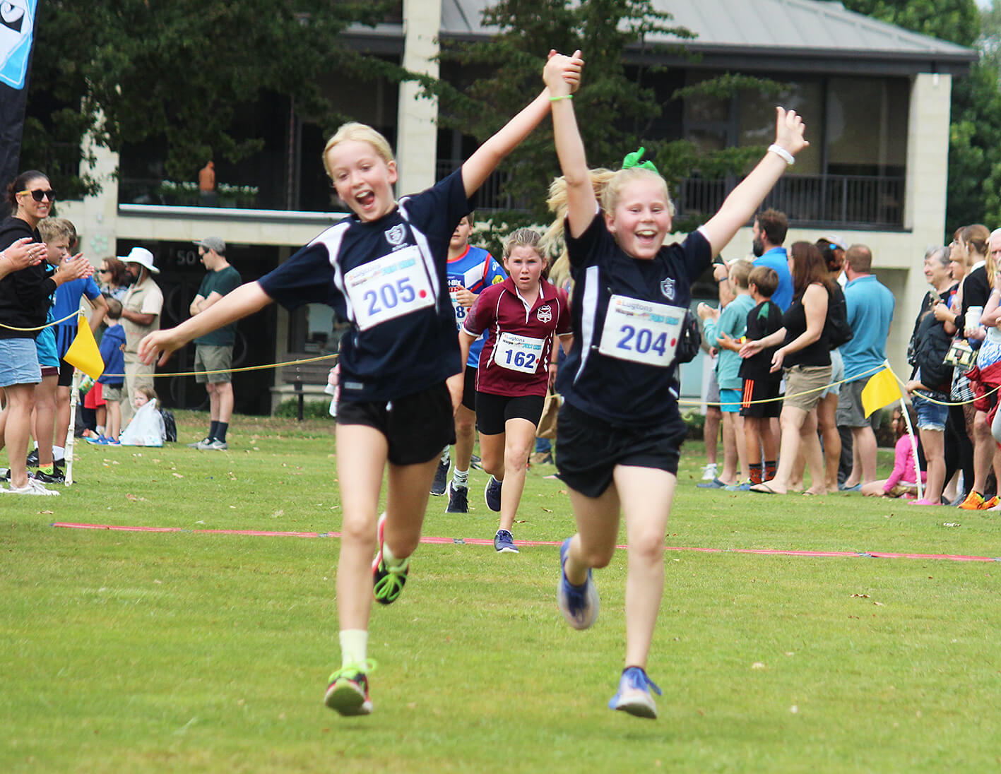 - Morrinsville’s Amelia Kerr (162) of St Joseph’s School watches from behind as St Peter’s Catholic schoolmates Zara Sudfeldt (205) and Grace Littlejohn (204) cross the line in 19th and 20th in the year 7 and 8 2km race.