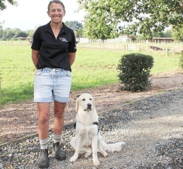 Owl Farm demonstration manager Jo Sheridan of Pirongia with farm hostess Emjay, a six-month-old labrador. Photo: Mary Anne Gill