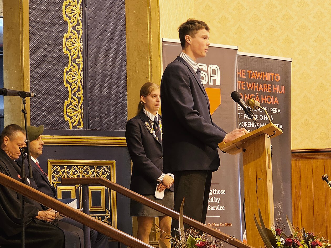 - Hayden Waddell of St Peter’s School, Cambridge gives an address at the Anzac Day Commemoration Service in the Town Hall watched on by Georgie-Rose Boyd.