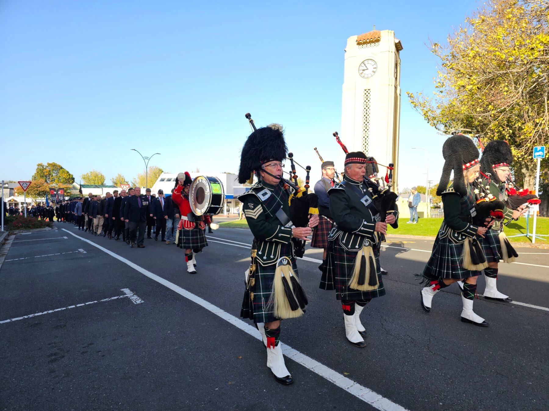 - The Cambridge and Districts Pipe Band marches past the Town Clock.