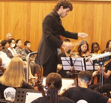 The locally based players in the orchestra included Joel Mansor, 1st horn, Grace Cox, 2nd violin, Katie Li, viola section leader (all St Peter’s School, Cambridge), Kezia and Gabrielle Schuitemaker, 1st violin, Seumas Eade, timpani and percussion (Matangi), Poen Hsieh, 2nd violin (Newstead).