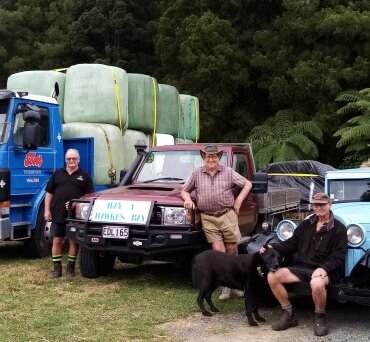 Resting up while loading their ‘Hay to Hawkes Bay’ vehicles are Brian Scott, Noel Yearbury and Denis Beech, with BB the dog.