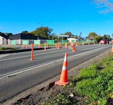 - The temporary cycleway and footpath looking west towards town outside Te Awa Retirement Village.