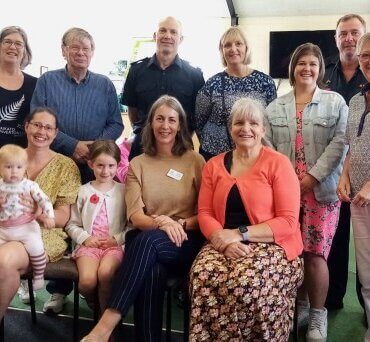 Christmas Festival Society president Deb Robinson, right, with representatives of some of the recipient groups. Pictured, back from left, Dawn Harpur (Octopus for Preemies), Adrienne Windsor (Waikato Rivertones), Paul Murphy (GW Railway Modellers), Phil Johnson (Volunteer Fire Brigade), Marilyn Bird (CCH), Selby McClelland (Achievement House) and Peter Wright and Richard Crease (Voluntary Fire Brigade). Front, Sally Hall (Cambridge Toy Library), Jo Simpson (La Leche League) with Charlotte and Samantha, Heidi Gleeson (True Colours) and Gabby Byrne (CCH).