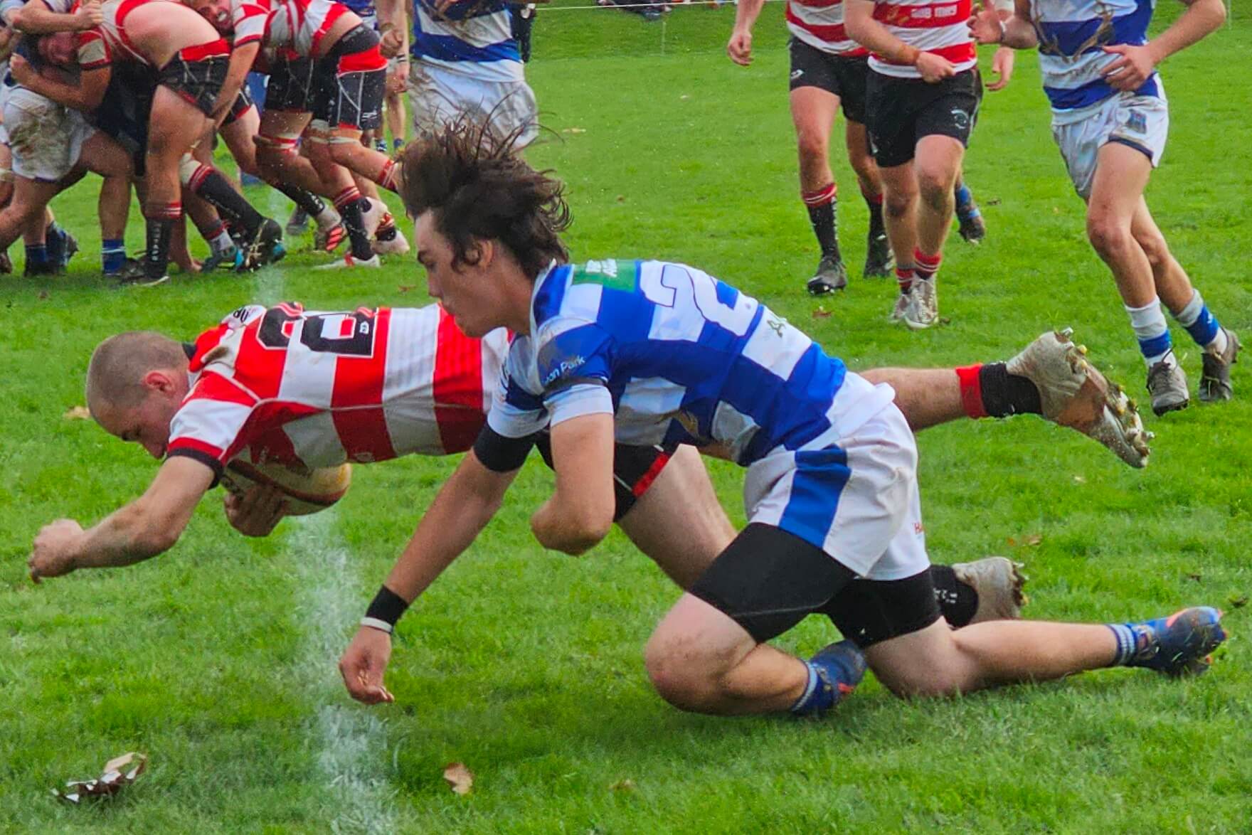 - Hautapu substitute Blake Seavill dives over for a try in the corner late in the match in the tackle of Leighton King. Photo: Mary Anne Gill.