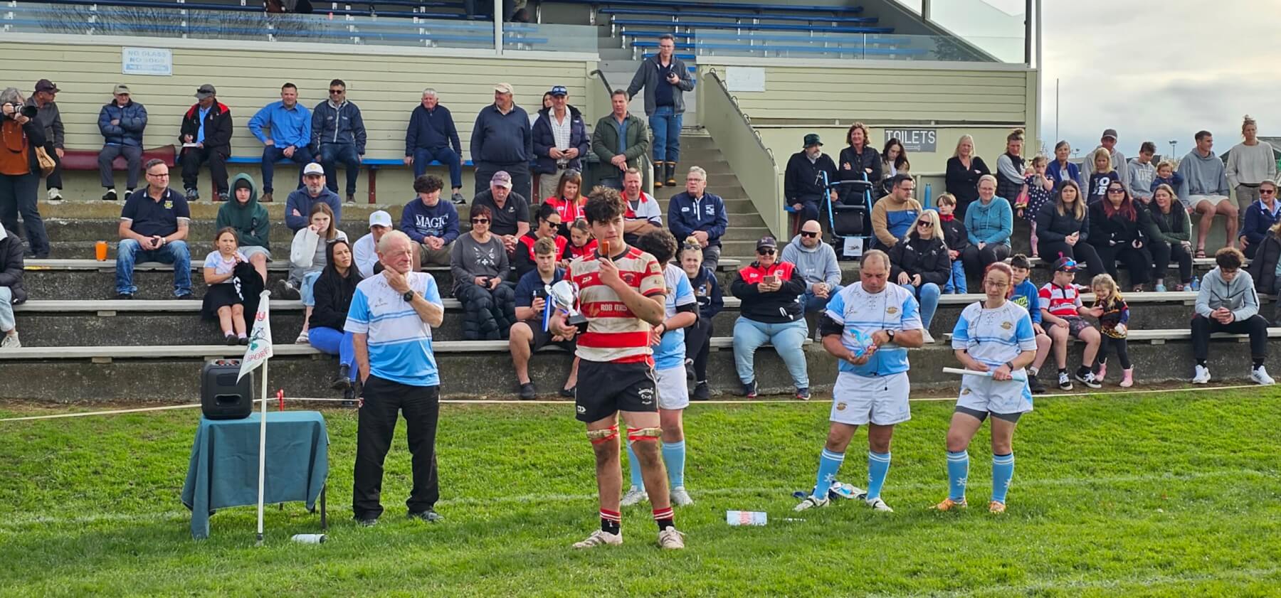 - Hautapu captain Joel Hazelton, who scored two tries in the match, accepts the Cambridge Referees’ Association Centennial Cup after his team’s 20-10 win over Leamington. Photo: Mary Anne Gill.