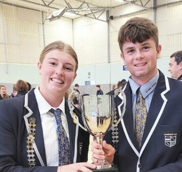 Leila Walker and Bastiaan Banks of Cambridge High School with the Battle of Waipā Trophy.