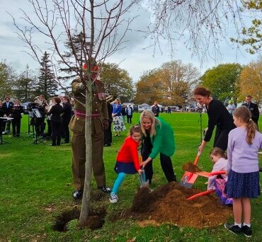Mayor Susan O’Regan and Cambridge Community Board chair Jo Davies-Colley had no shortage of help when planting a European lime in Victoria Square. From left, twins Viv and Maddie Storey-Ross, 6, and Piper Johns, 7, get stuck in watched by Brigadier Jon Broadley while the Cambridge Brass Band plays on. Photo: Mary Anne Gill.