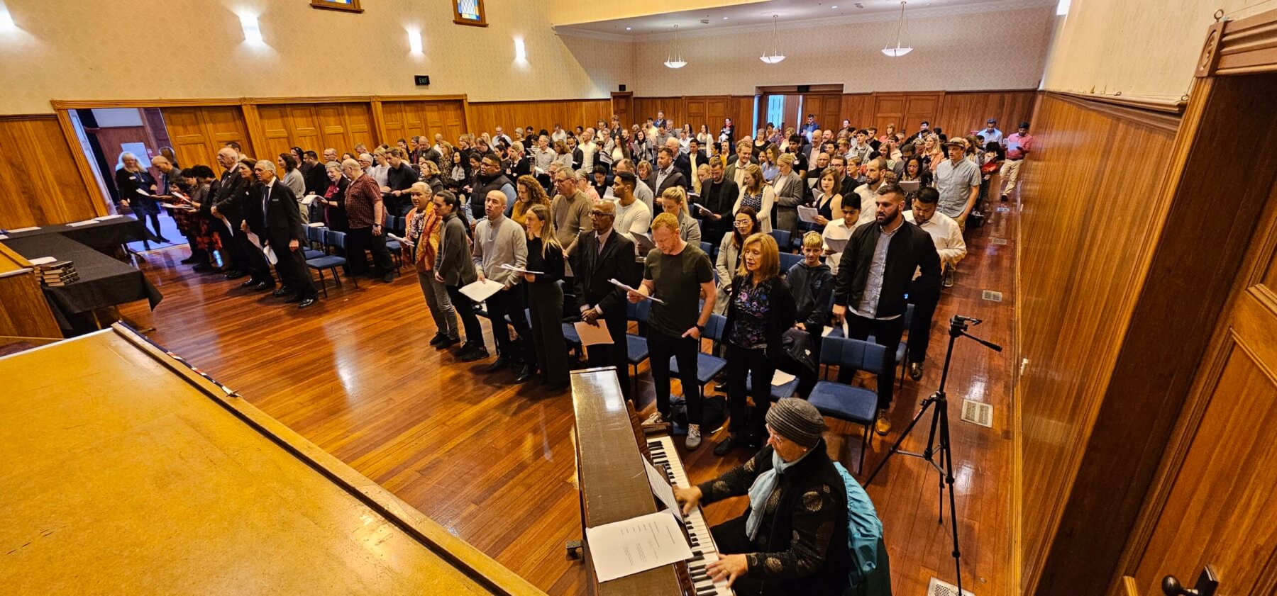 - Australian pianist Joy Hood plays the national anthem in the Cambridge Town Hall as the new Kiwis join in.