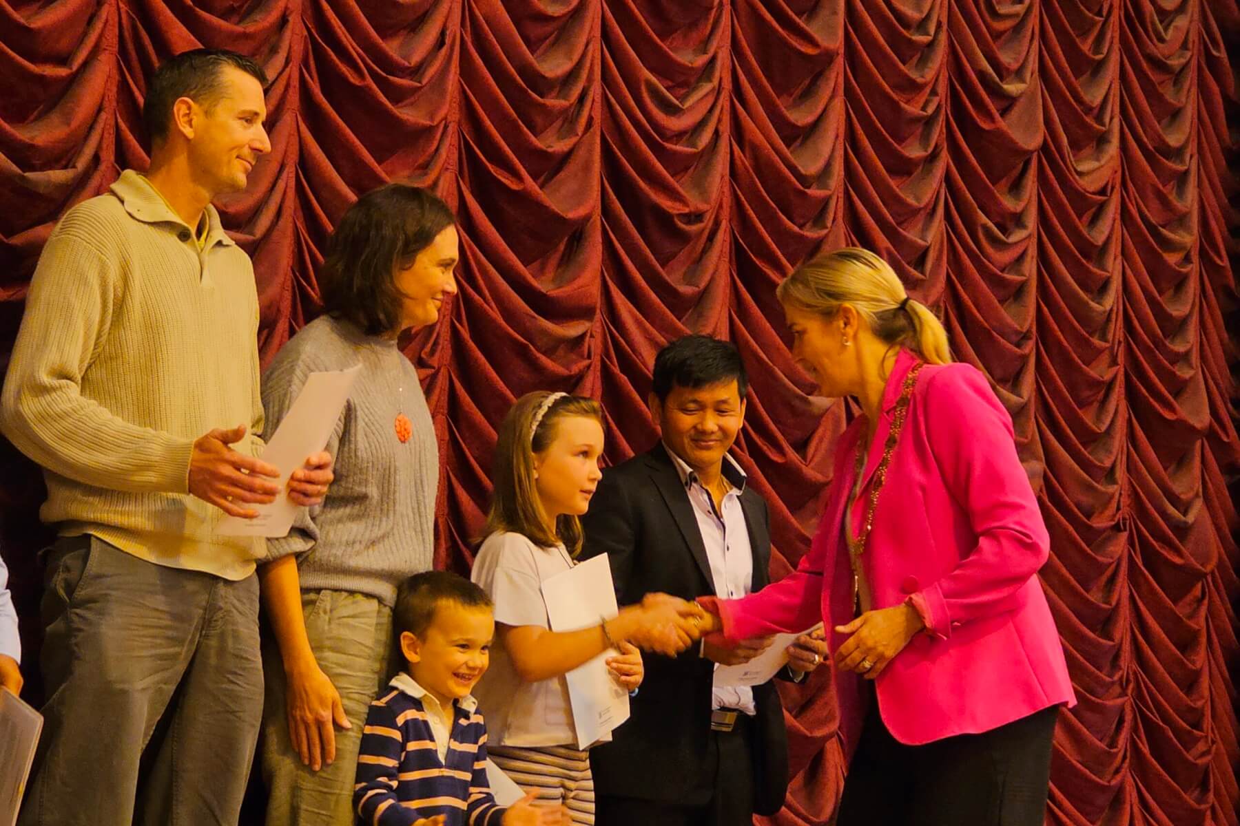 - Harriet Robson, 9, shakes Waipā mayor Susan O’Regan’s hand after making her affirmation to become a Kiwi. Looking on, from left, are her father Christopher, mother Georgina and little brother Fraser, 4, who was already a New Zealander.