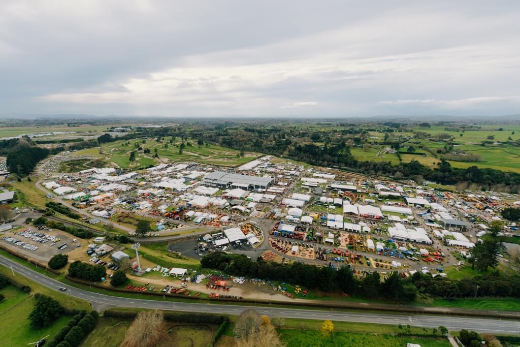 - An aerial view of Fieldays 2022 with Tieke Golf Course to the left.