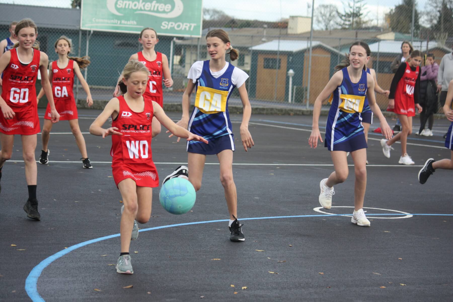 - Hautapu’s Lucy Collins chases the ball watched by teammates from left Hollie McIntyre, Amelia Hohneck and Poppy Smythe while Leamington players Izy Bond (GA) and Charlotte Rennie (WA) look on.