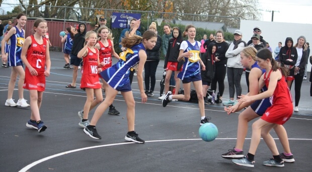 - Leamington Year 8 A Kahikatea’s s Sina Harris (C) bounce passing to Eva Fleming (GS).