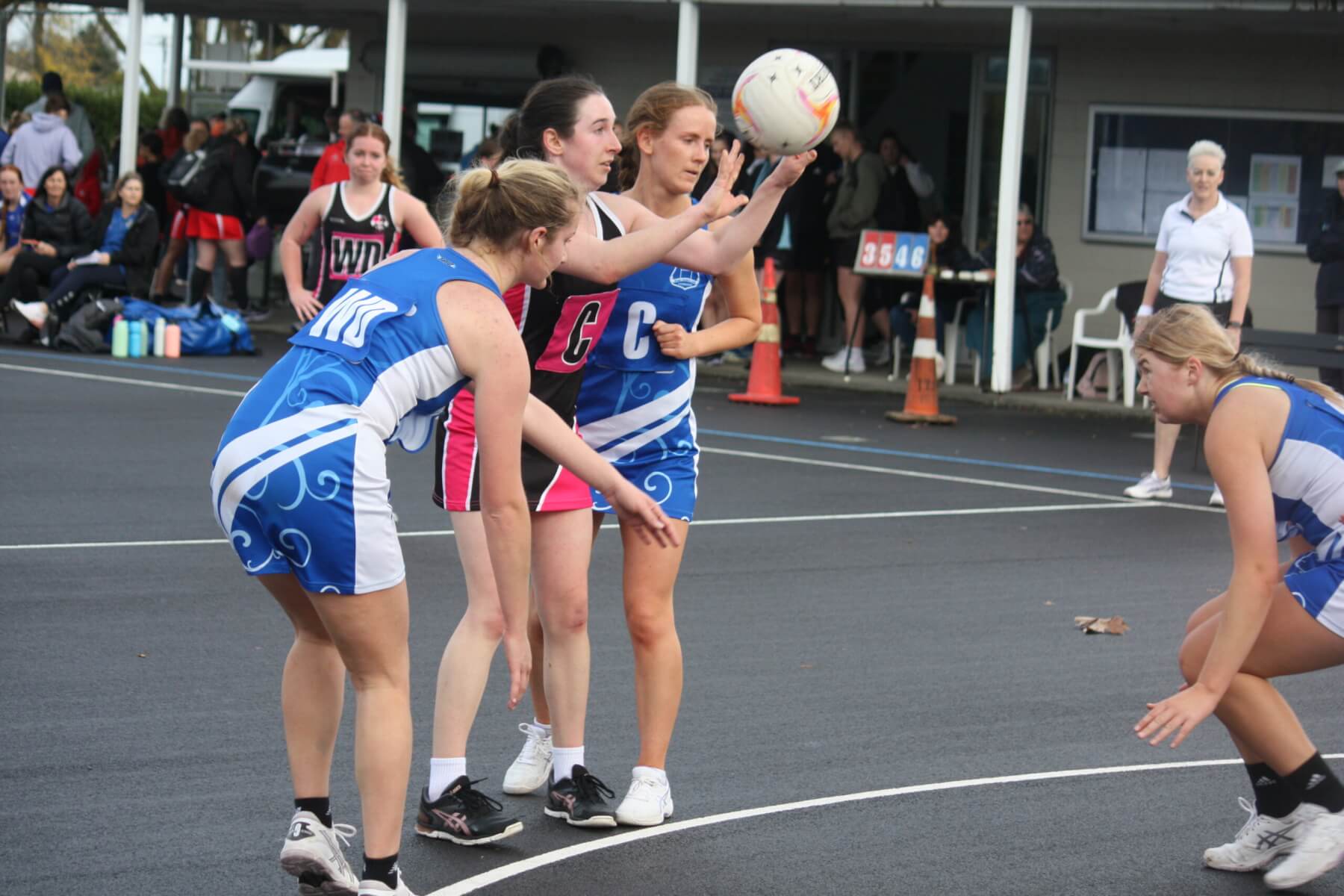 There was plenty of action at the Cambridge Netball Centre on Saturday where players put their bodies on the line and battled to keep their footing in slippery conditions.