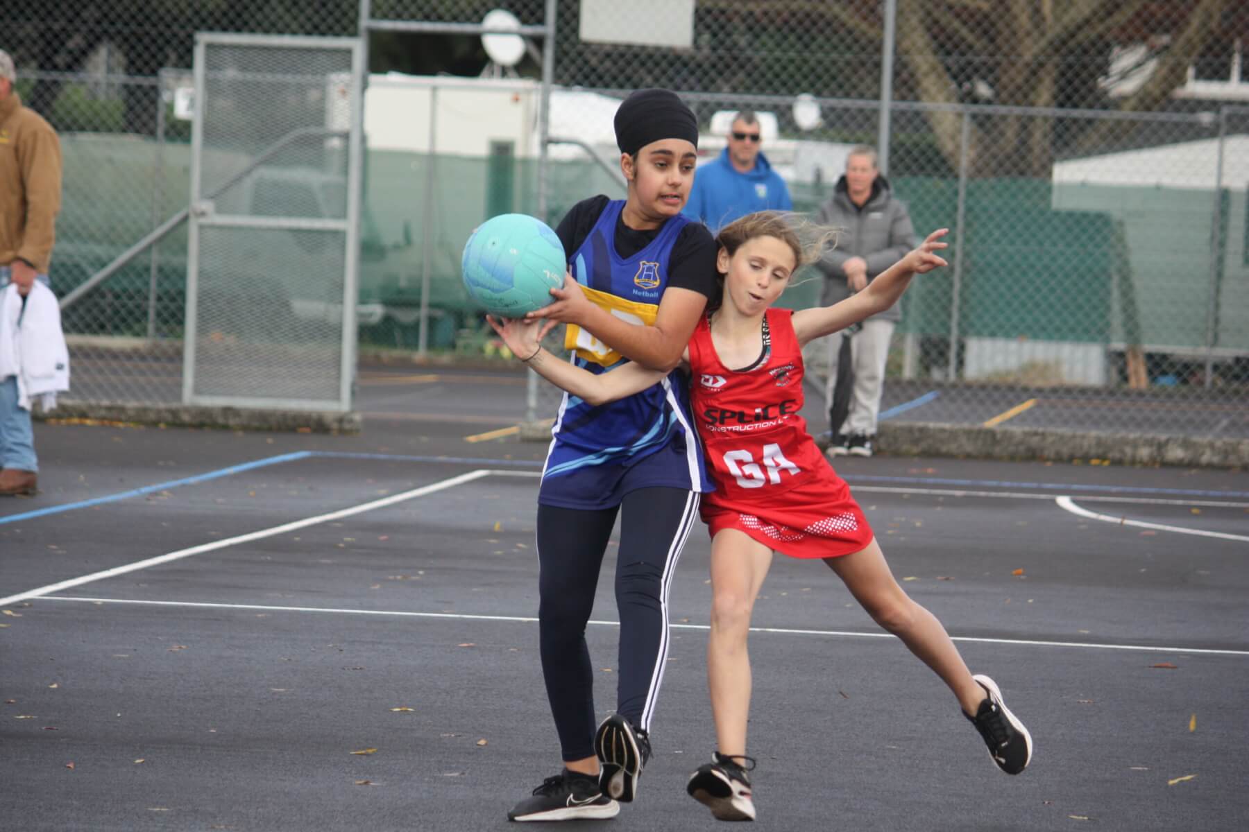 Leamington Junior Year 8A Kahikatea’s Pavneet Kaur vies for possession with Kahu Quinlan of Hautapu Marama watched by Mila Steenkamp. Leamington won 17-7. Photo: Mary Anne Gill.