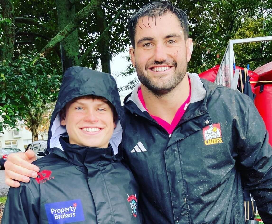- Evan Cram with Hautapu’s Luke Jacobson at the Chiefs training. Photo: Supplied