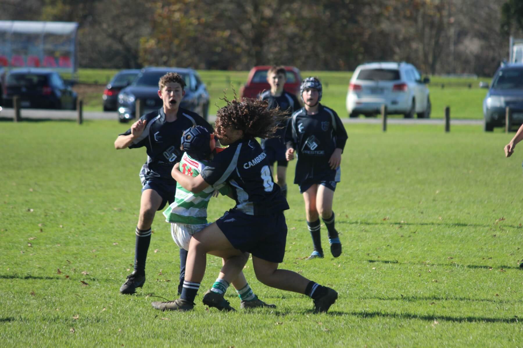 - This crunching tackle by Cambridge captain Tyler Taulanga on the Marist winger watched by Hugo Pettit, left, resulted in a penalty to the visitors.