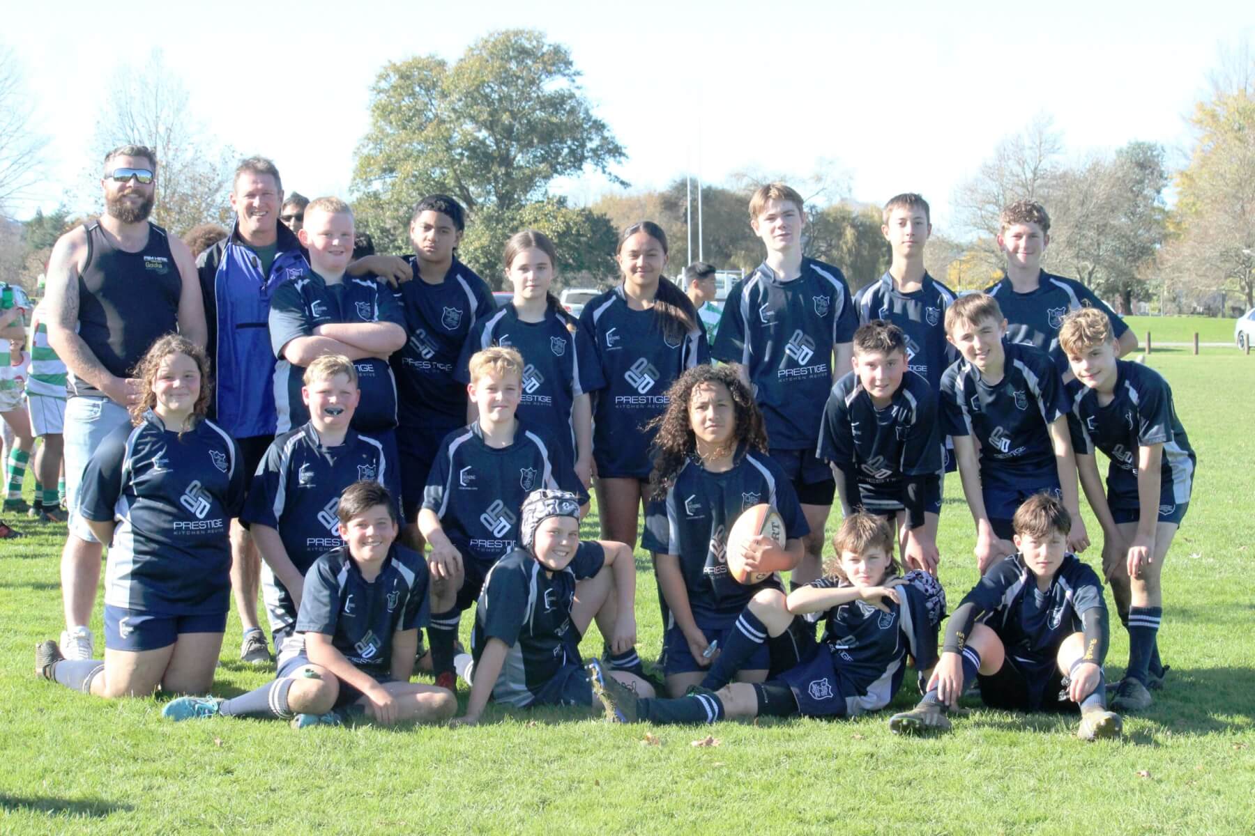 Winners are grinners: The Cambridge 13th grade team after the win over Hamilton Marist. From left, back row: coaches Craig Bennett and Mike Pettit, Hanru Bekker, Sharvay Wirihana, Emma Hanham, Paige Vave, William Hayde, Jake Walling, Hugo Pettit.