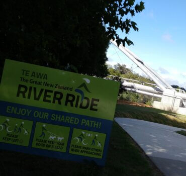 Te Awa River Ride finishes at the Gaslight Theatre in Cambridge but supporters have always favoured extending it over the Wastewater Pipe Bridge, pictured behind the sign. Photo: Mary Anne Gill