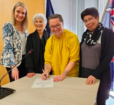 Emotional ceremony, from left: Chief executive Garry Dyet, Iwi Relations advisor Shane Te Ruki, councillor Bruce Thomas (at rear), Wāipa mayor Susan O’Regan, Māori ward councillor Dale-Maree Morgan, deputy mayor Liz Stolwyk, Haona Kaha Grace (Nanny Haona) and Robyn Nightingale.