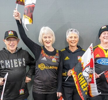 Cambridge-based members of the ‘Waikato Chiefs Rugby’ team are Jan Watts, Ian Moore, Pam Moore, Josie van Weerd, Don Wilson and Denise Whybrow. Photo by Michael Jeans.