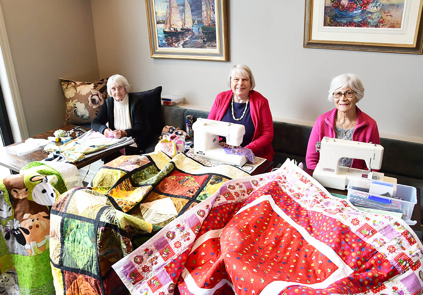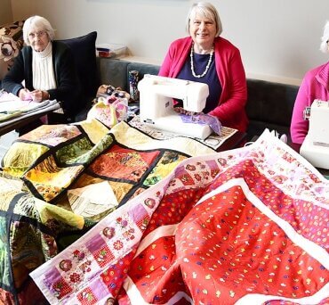 Soon after Cambridge Oaks opened around 2019, one of the many groups formed within the village was a craft group. Comprising knitters and sewers, the group gravitated to focus on quilting. Membership over the past four years has grown to about 15 women, about half sewers and half knitters.