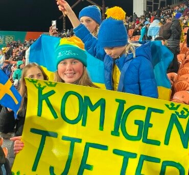 Elin Gainsford at Waikato Stadium with her Swedish supporter’s sign, “kom igen tjejer”, which translates to “let’s go girls!”