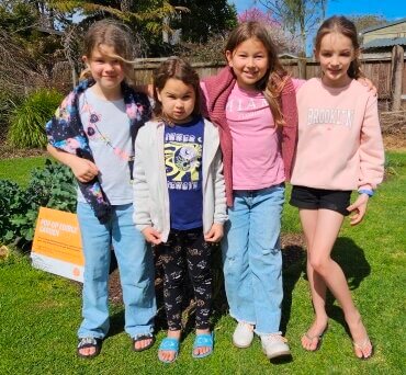From left Kendal Baird, 9, Amelia-Rose Bubb, 9, Sophia Gawler, 8, and Lilly-Mae Bubb, 6, from Leamington Primary School at the Froude Reserve pop up garden, Leamington, Cambridge. Photo: Mary Anne Gill.