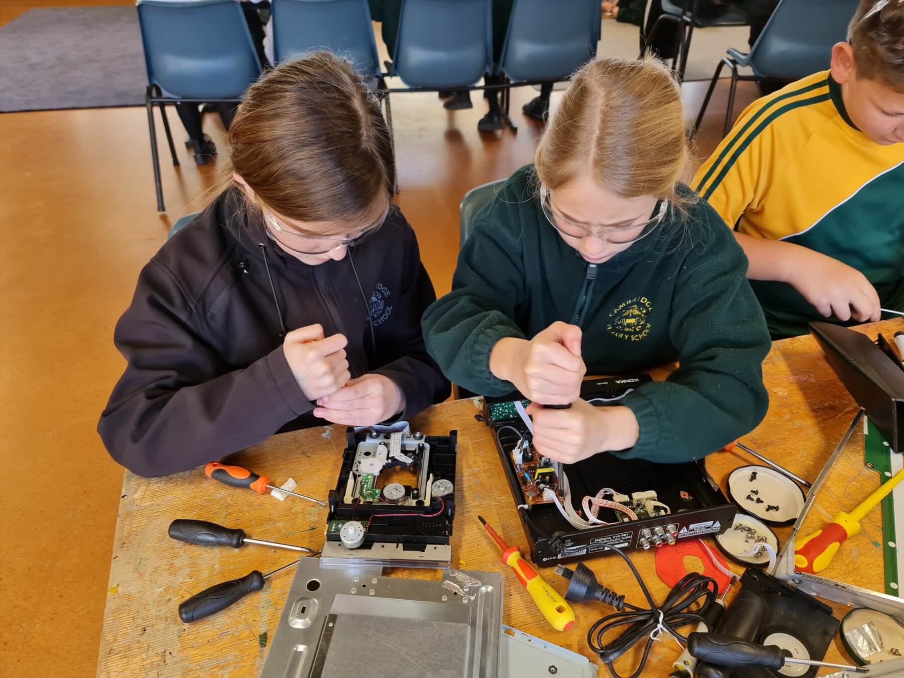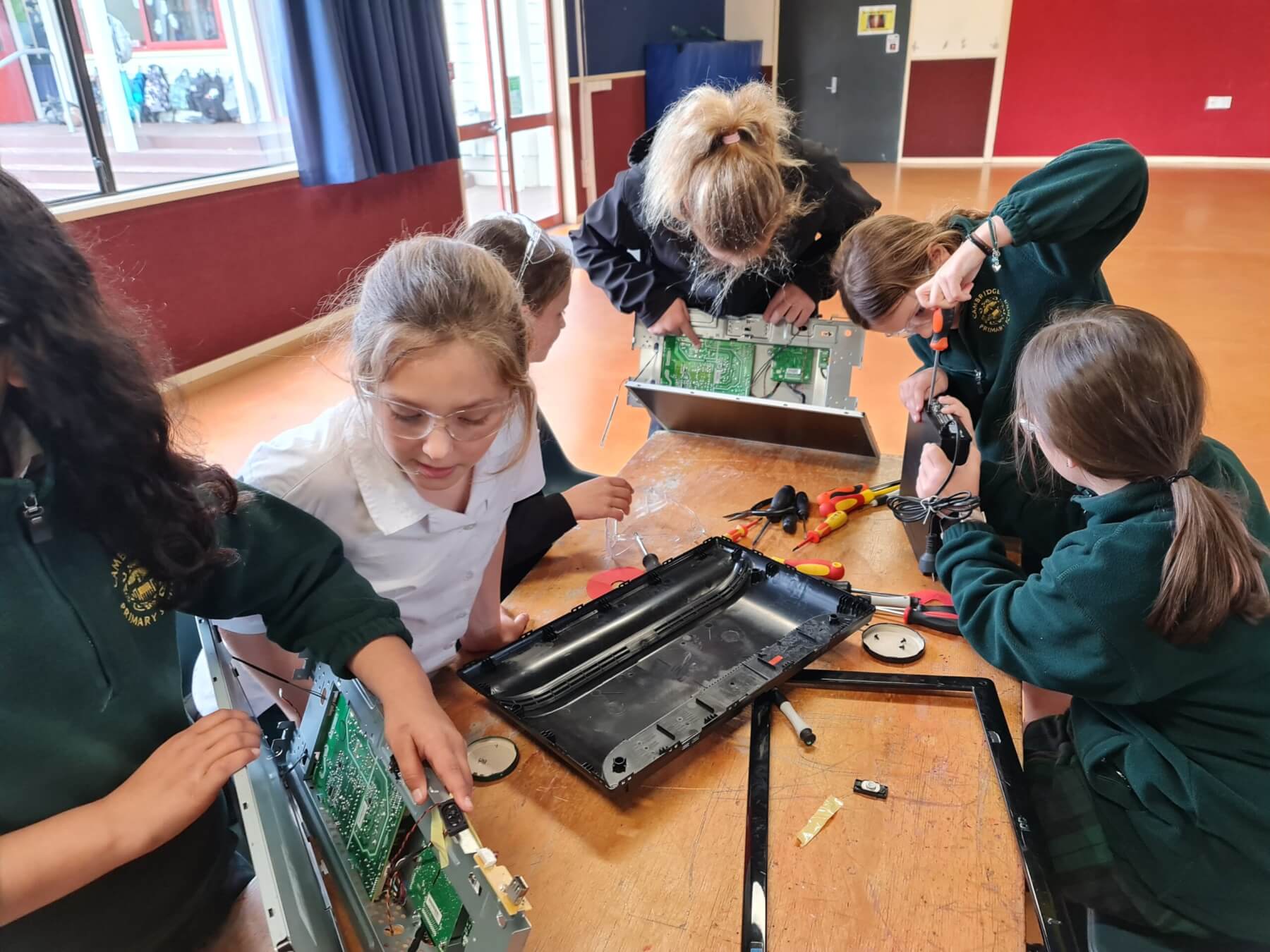- Cambridge Primary School students (from left) Antara Agrawal, Delaney Wallace, Maeve Loughrin, Harper Miller, Kierly Miller and Aurora Wilson dismantle e-waste under the guidance of Geoff Bentley from TechLeap (out of shot).