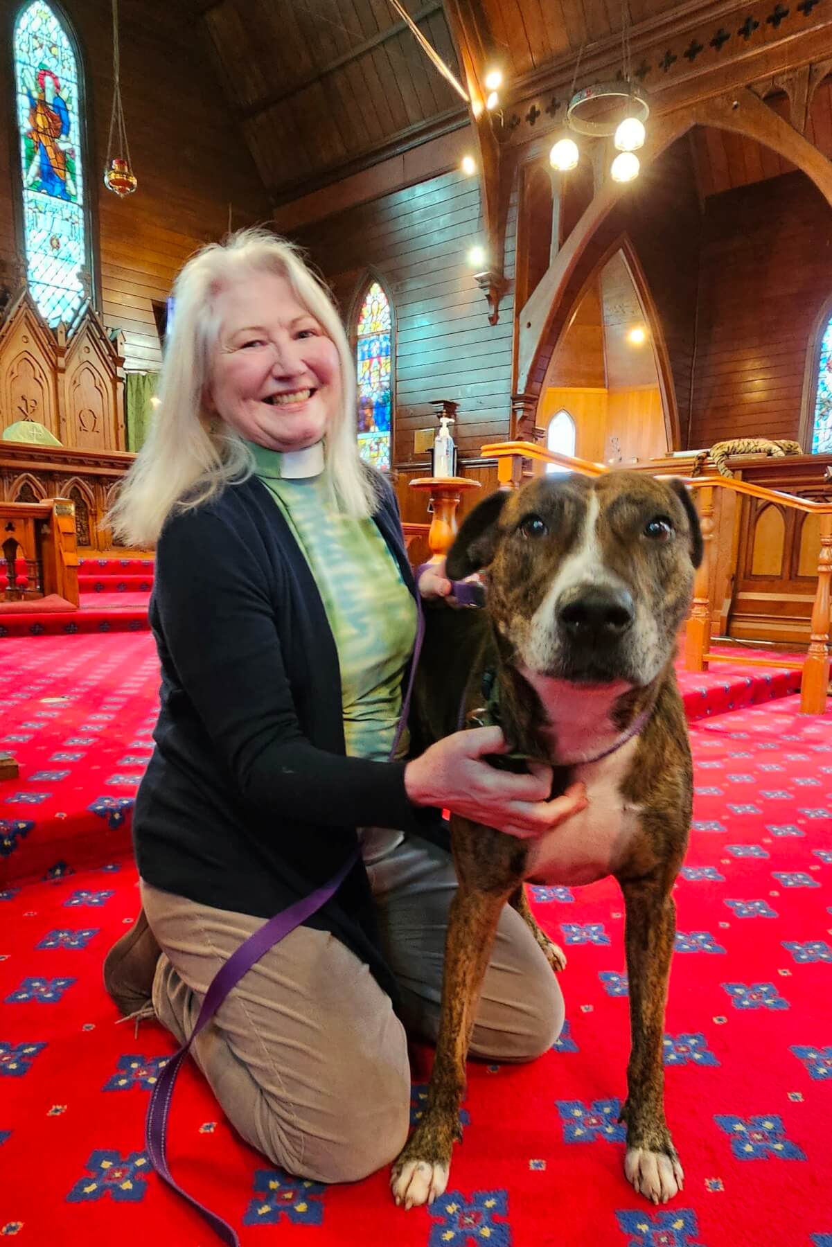 - Rev Jennie Savage meets Nimmy, 3 year old Huntaway and owner Jo Davies-Colley at the Blessing of the Pets.