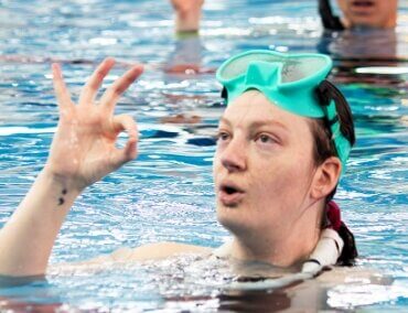 Brigitte Nathansen gives the “I’m okay” signal after surfacing during the 2023 Aida Freediving New Zealand Pool Nationals. Photo: Adrian Bosi