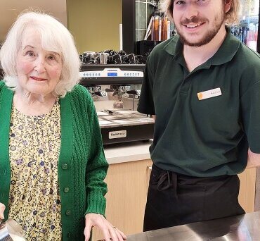 Bev Geange, a resident of Arvida Lauriston Park in Cambridge, helping café assistant Reuben Hunt make her double flat white.