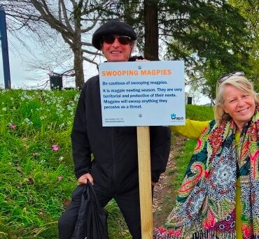 Rob and Janet Weeks were visiting Cambridge this week and did a double take when they saw a sign advising them to be cautious of swooping magpies.