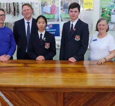 St Peter’s Cambridge Head of School Marcus Blackburn, left, head of technology, teacher Michael Moore, year 11 student Yongyan Wang and year 12 student Harry Bishop with Salvation Army Family Store assistant manager Denise Burrows and store volunteer Jenny Carson behind the store’s newly-installed rimu counter on Friday. Luke Brouwer is absent. Photo: Jeremy Smith
