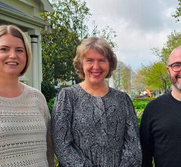 Cambridge Town Hall chair Kirsty Johnson, left, and general manager Simon Brew, right, with Destination Cambridge general manager Ruth Crampton outside the hall. Photo: Mary Anne Gill.