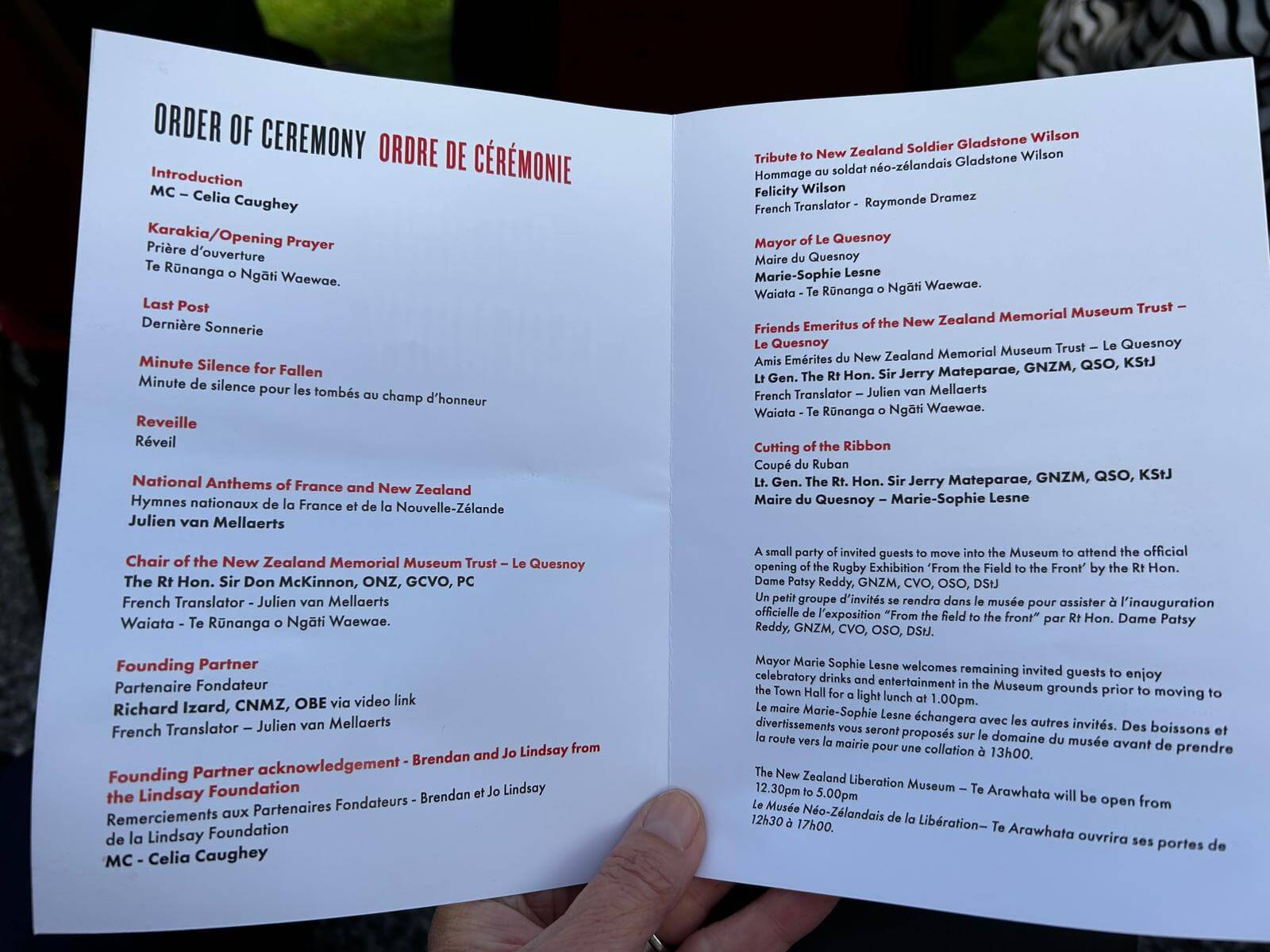 The official opening will be attended by dignitaries including Vice Admiral Sir Tim Laurence (husband to Anne, The Princess Royal); the Rt Hon. Dame Patsy Reddy (Chair of New Zealand Rugby); Clare de Lore, Lady McKinnon; Sir Lockwood Smith and Lady Alexandra Smith; George Hickton (Chair of Wētā Workshop); Andrew Thomas (Senior creative director Wētā Workshop); Tracey Collis (Mayor of Tararua District Council); Susan O’Regan (Mayor of Waipa District Council); Grant Smith (Mayor of Palmerston North City Council); Sir Wayne “Buck” Shelford (National President NZ RSA); and families who are descendants of soldiers involved in the liberation of Le Quesnoy.