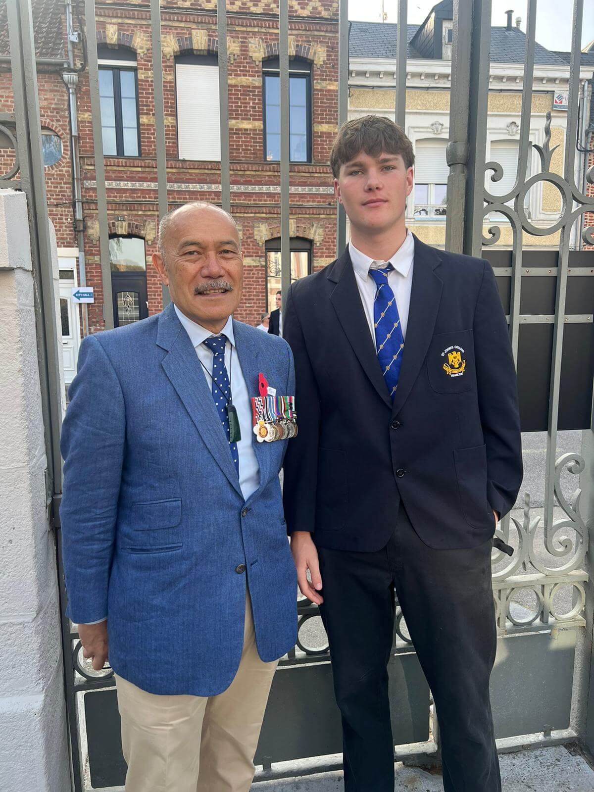 l-r Curtis Reymer of Ohaupo wearing his St John’s College, Hamilton uniform, his mother Waipa deputy mayor Liz Stolwyk, Sir Lockwood Smith, Waipa mayor Susan O’Regan, Sir Timothy Laurence, at the opening of the Te Arawhata – New Zealand Liberation Museum in Le Quesnoy. Photo: Supplied.