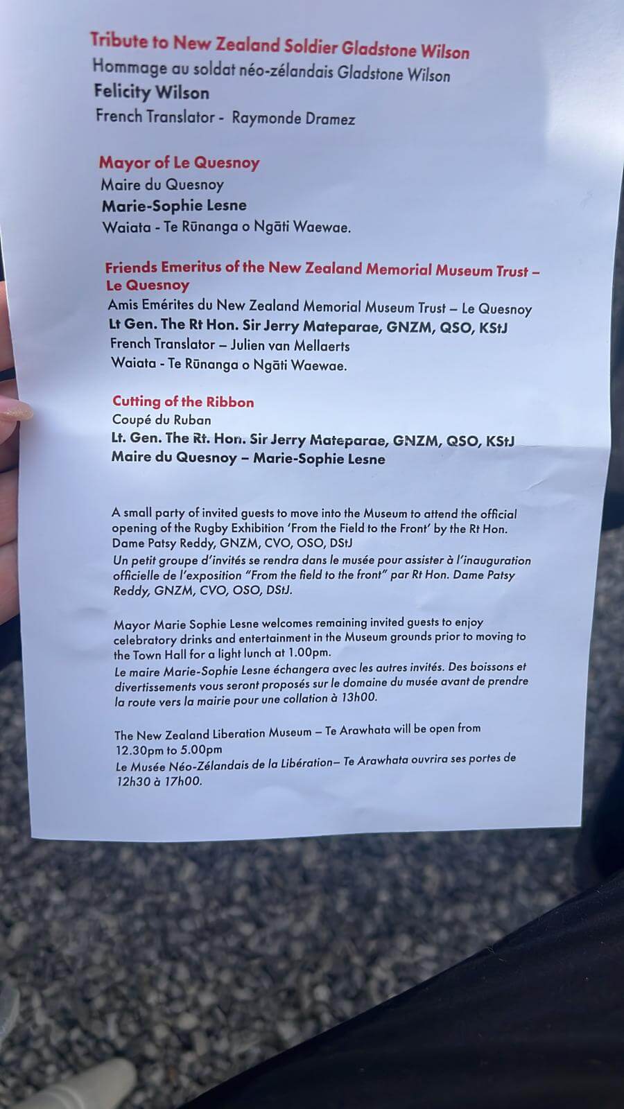 - The NZ Liberation Museum – Te Arawhata opened by the Rt Hon. Sir Jerry Mateparae and Marie-Sophie Lesne, the mayor of Le Quesnoy..