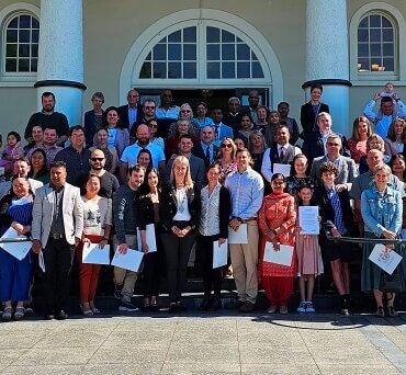 Waipā’s new citizens with mayor Susan O’Regan outside the Cambridge Town Hall after the citizenship ceremony on Friday. Photo: Mary Anne Gill