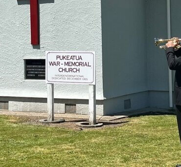 Cambridge Brass Band bugler Doug Rose playing The Last Post outside Pukeatua War Memorial Church, newly-fitted out with its bell.