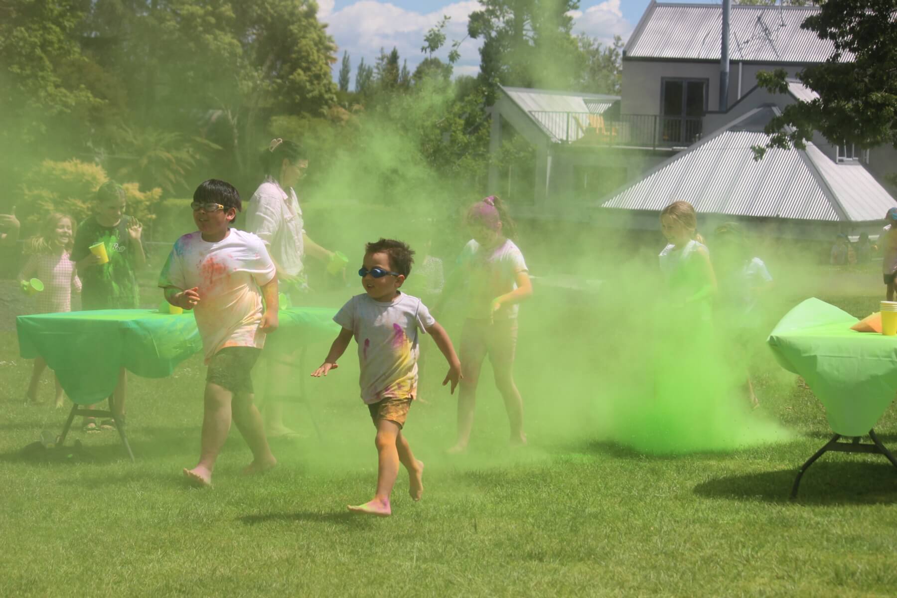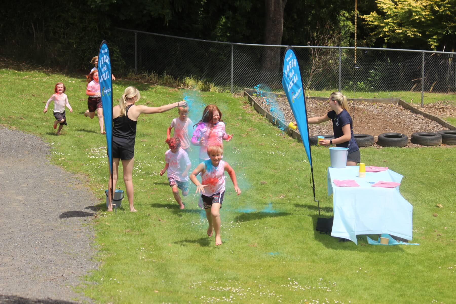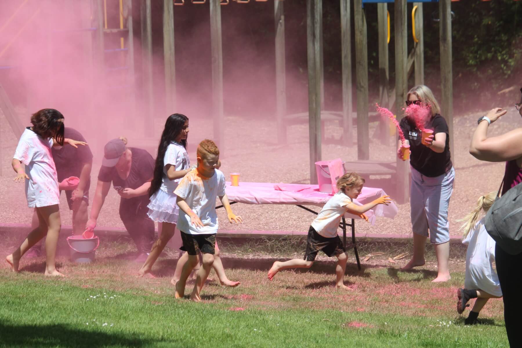 Children registered to run through stands where blue, pink, yellow, orange, red, purple and green were thrown over them and then capped it off by sliding down a water slide with principal Mike Pettit taking great delight at holding the hose.
