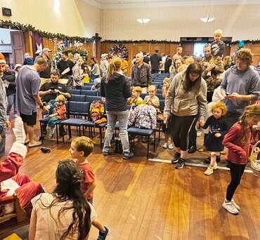 Santa greets a child while others wait patiently. They were at the annual Cambridge Christmas Festival in the Town Hall which opened last week bringing back the magic of the season to the town once again. The Cantando and Venite choirs entertained on Saturday while Sunday saw volunteers swamped with overflow visitors from the Christmas Parade. Santa Claus, who makes regular visits to the hall, was the star attraction then. The festival continues until Sunday December 17. Photo: Mary Anne Gill.