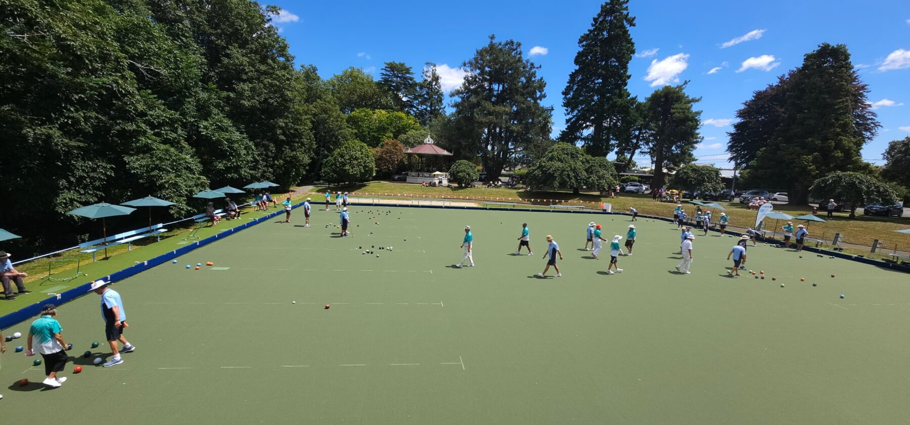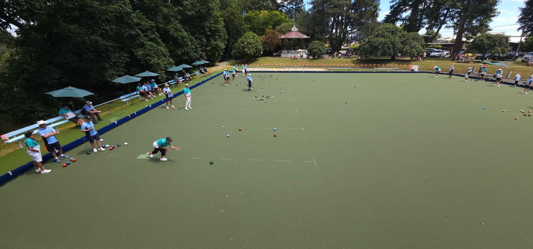 Scenes of the bowling from the first floor of the club house looking towards the Band Rotunda, Lake Te Koo Utu and the newly-laid green. Photos: Mary Anne Gill.