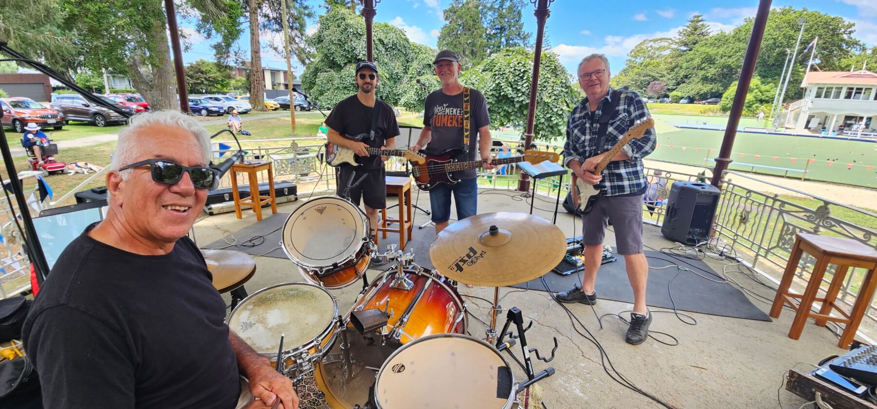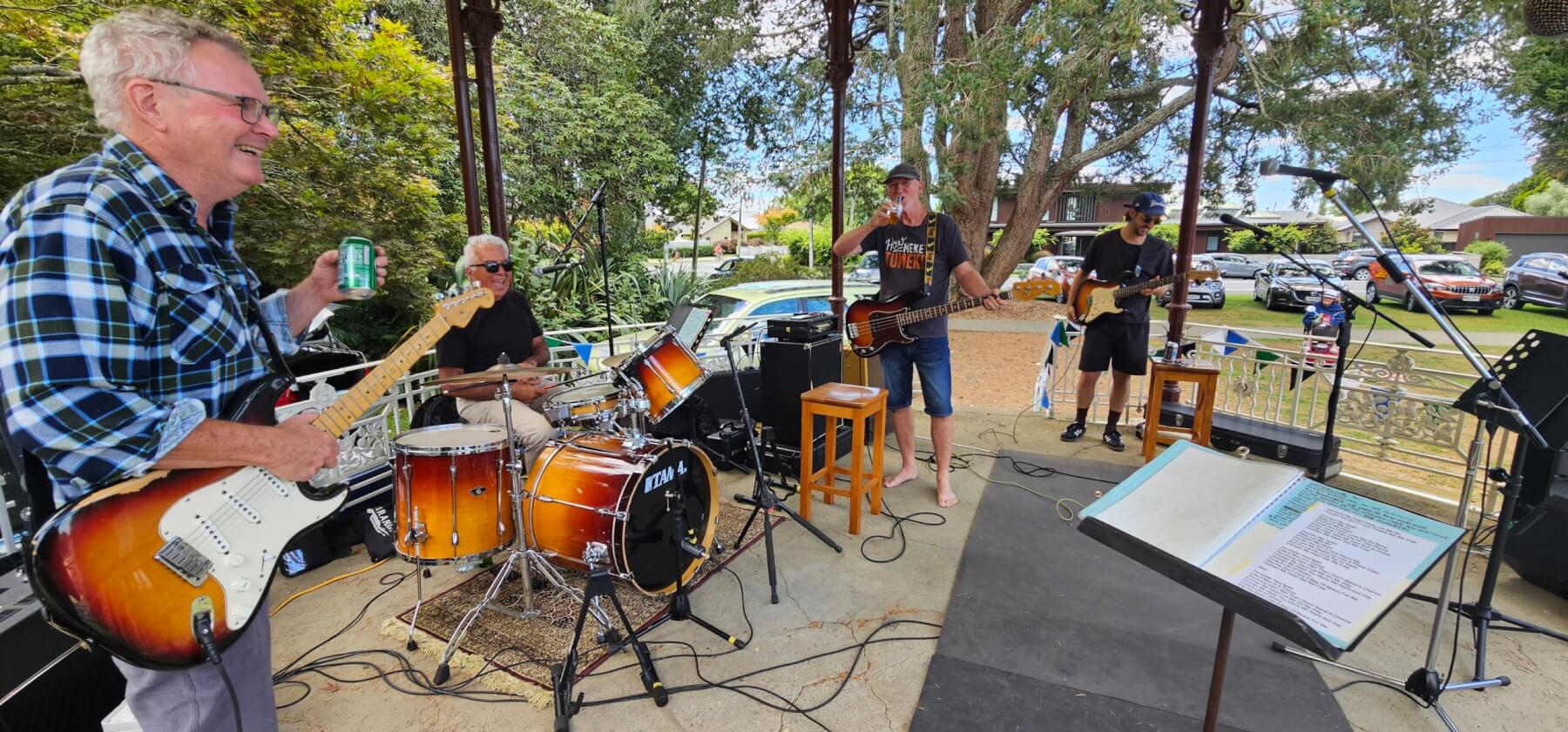 The Slims take a break from the music in the Band Rotunda, from left, Jono Knapp, Ken Emery, Mark Taylor and Paul Taranaki during Cambridge Bowling Club’s final 125th celebrations. Photo: Mary Anne Gill.