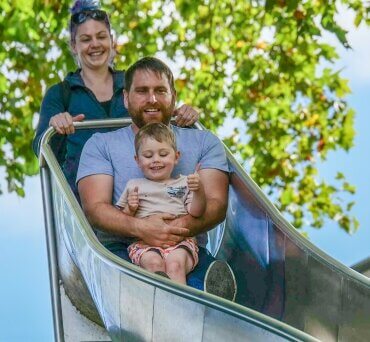 Karāpiro Domain slide fun: Bridget Burmester, husband Dane and four-year-old son Blue on the slide at Karāpiro Domain in the award-winning photo by Jane Thompson.