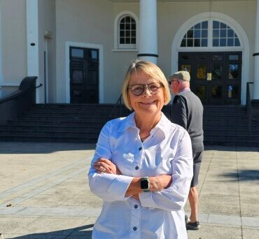 Catherine Gibson outside the Cambridge Town Hall which she describes as a cultural jewel. Photo: Mary Anne Gill.