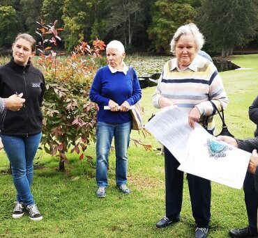 Joan McCathie, in striped jersey, was always in the thick of the action when projects such as the development of Lake Te Koo Utu involved the Cambridge Tree Trust. Photo: Mary Anne Gill.