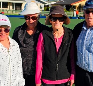 Looking good, from left Maureen Field, Dale Small, Anne Lyes and Ron Greenwood pause during the roll up on the new Tiger Turf. Photo: Mary Anne Gill.