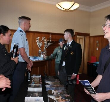 New Zealand Defence Force Waikato regional recruiter Texas Ngarongo-Porima (left) chats to Cambridge High School student Zach Clarke about a career in the Navy.