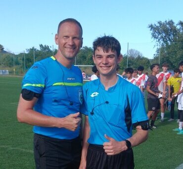 Cambridge football referee Liam Weston (right) with Polish referee Michal Fudala at an IberCup match.